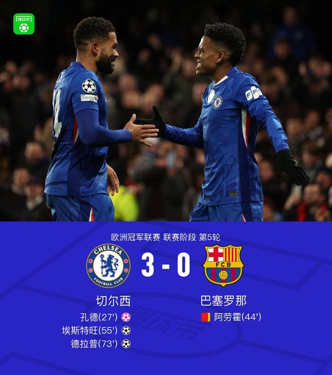 北京时间11月26日,欧冠联赛第五轮,切尔西主场迎战巴塞罗那。恩佐上半场梅开二度,但被判越位在先。孔德在门前打进乌龙球。阿劳若吃到两张黄牌、一张红牌,被罚下场。下半场桑托斯进球,但因越位被判无效。埃斯特万进球,德拉普发球锁定胜局。全场比赛结束,切尔西3-0战胜巴塞罗那。关键时刻:第27分钟,库库雷拉传中,内托头球攻门,孔德不慎自摆乌龙。切尔西1-0。第44分钟,阿劳霍因撞倒库库雷拉被红牌罚下。第55分钟,埃斯特班右路连续抽射破门。切尔西2-0巴塞罗那。第73分钟,恩佐传球,德拉普破门。切尔西3-0巴塞罗那。两队球员在激动人心的时刻入场。 KING OF KLUBS 游戏开始了!切尔西球迷聚集在巨大的 TIFO 中为他们的球队加油。前两分钟动作太多。查洛瓦找球,踩到了莱万多夫斯基的脚踝。第4分钟,恩佐胸部停球后射门,但先是被判手球犯规,进球被判无效。第6分钟错失绝佳机会。费兰·托雷斯介入,球射偏。第8分钟,詹姆斯尝试远射,但皮球被加西亚挡出。第13分钟,费尔明接到亚马尔传球后中路倒地,但裁判没有示意。第15分钟,费尔明前插接球,但桑切斯解围时将其击倒。第23分钟,恩佐头球破门,但查洛瓦越位位置干扰皮球。切尔西1-0。第29分钟,詹姆斯禁区外抽射破门。球险些击中球门。第33分钟,亚马尔接球低射。桑切斯没收了球。第36分钟,半自动比赛回放显示,库库雷拉接到传球,但没有被判越位。第40分钟,古斯托拉倒巴尔代特吃到黄牌。第44分钟,阿劳霍放倒库库雷利。已经被染黄了,两名黄人只剩下一名球员被罚下场。第46分钟,拉什福德换下费兰。第51分钟,桑托斯门前插上破门。替他传球的加南乔被判越位。第55分钟,埃斯特万右路抽射破门。切尔西2-0巴塞罗那。第59分钟,加纳乔换下。第62分钟,德拉普替补登场。拉菲尼亚换下莱万多夫斯基。第69分钟,内托将球从防区带入禁区,射门得分。加西亚将球挡出。第71分钟,福法纳禁区内转身抽射。球不见了。第71分钟,德拉普摇头射门,但皮球偏出。第73分钟恩佐传球。德拉普推射得分。切尔西3-0巴塞罗那。第78分钟,S·图恩停球反应,恩佐追击试图射门,但被挡出。第79分钟,巴萨做出改变和调整。亚马尔被换下。第81分钟,拉菲尼亚调整角度射门。桑切斯立即倒地扑救。第81分钟,切尔西做出改变。乔治和阿查庞出现了。第89分钟,场上比分仍然落后。镜头再次展现了亚马尔队替补席上的阵容。技术统计